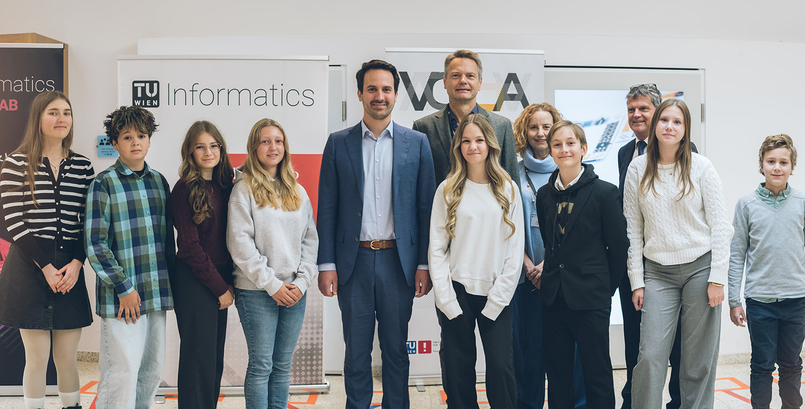 Sofia Vitrenko, Samuel Brinda, Theresa Gschossmann, Emma Bauer-Schatzberger, Minister Christoph Wiederkehr, Stefan Szeider (VCLA Co-Chair), Lara Perkovic, Agata Ciabattoni (VCLA Co-Chair), Lucio Frey, Jens Schneider (Rector of TU Wien), Julia Schabenböck, Lucian Hofmann (c) Amélie Chapalain / TU Wien Informatics